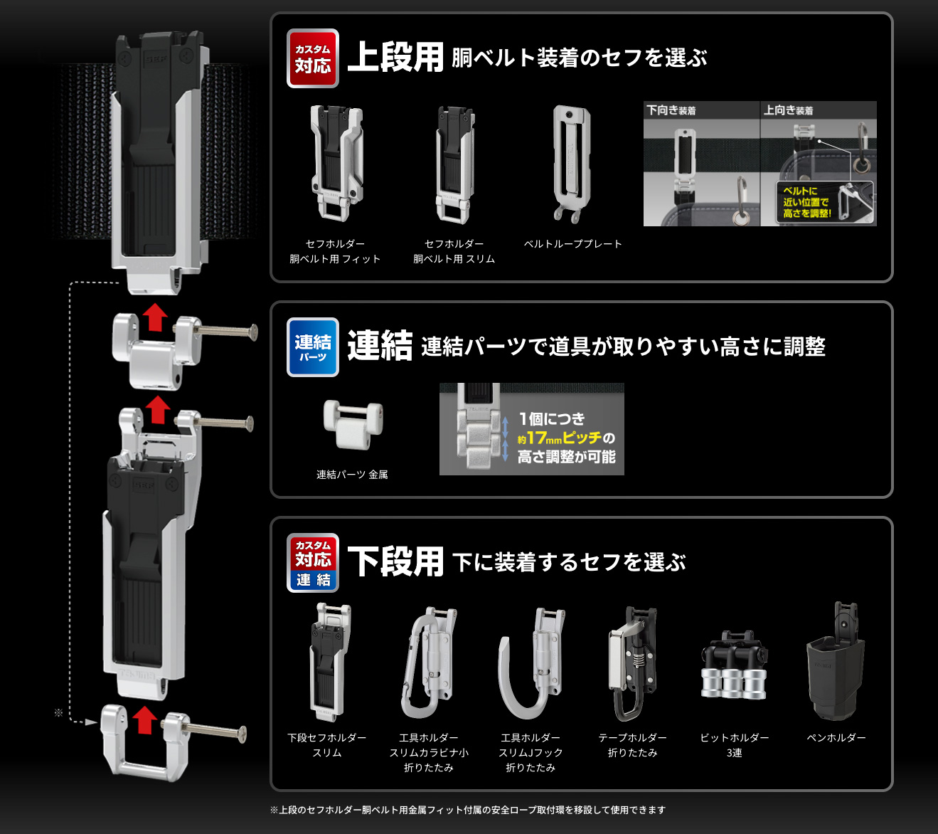 「体型に合わせて腰袋の高さを調整したい」「下段セフは欲しいが上段セフは要らない」など、セフホルダーユーザーの要望も多様化しています。そこで開発されたのが「カスタマイズありき」のセフホルダーです。ユーザーの細やかなニーズにお応えできるようカラビナやJフック、セフテープホルダーなどを加えた多彩なラインナップになっています。