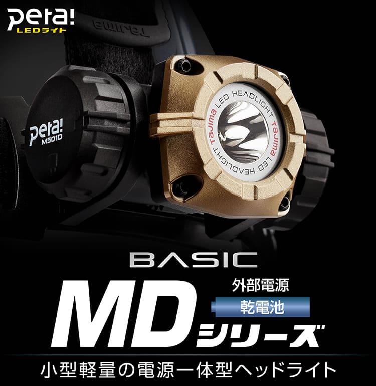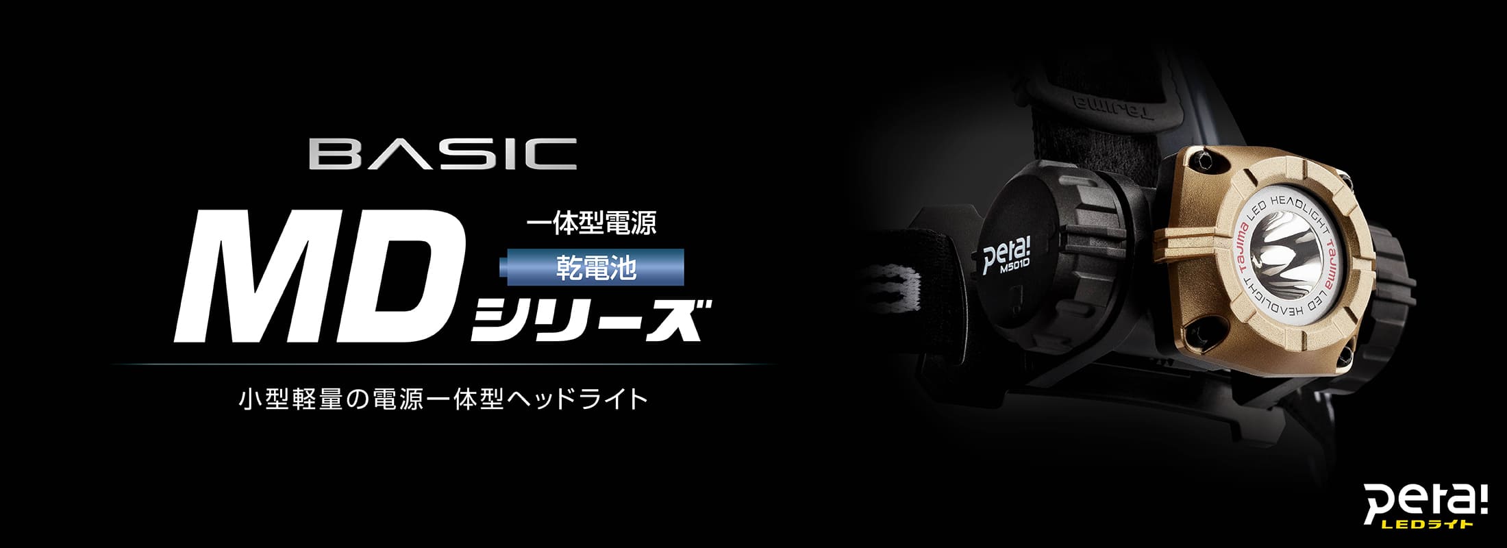 単3形または単4形電池使用、小型・軽量の電源一体型LEDヘッドライト。