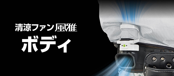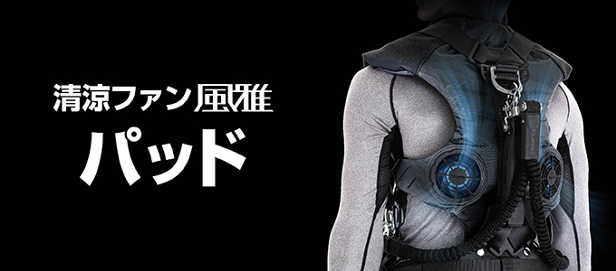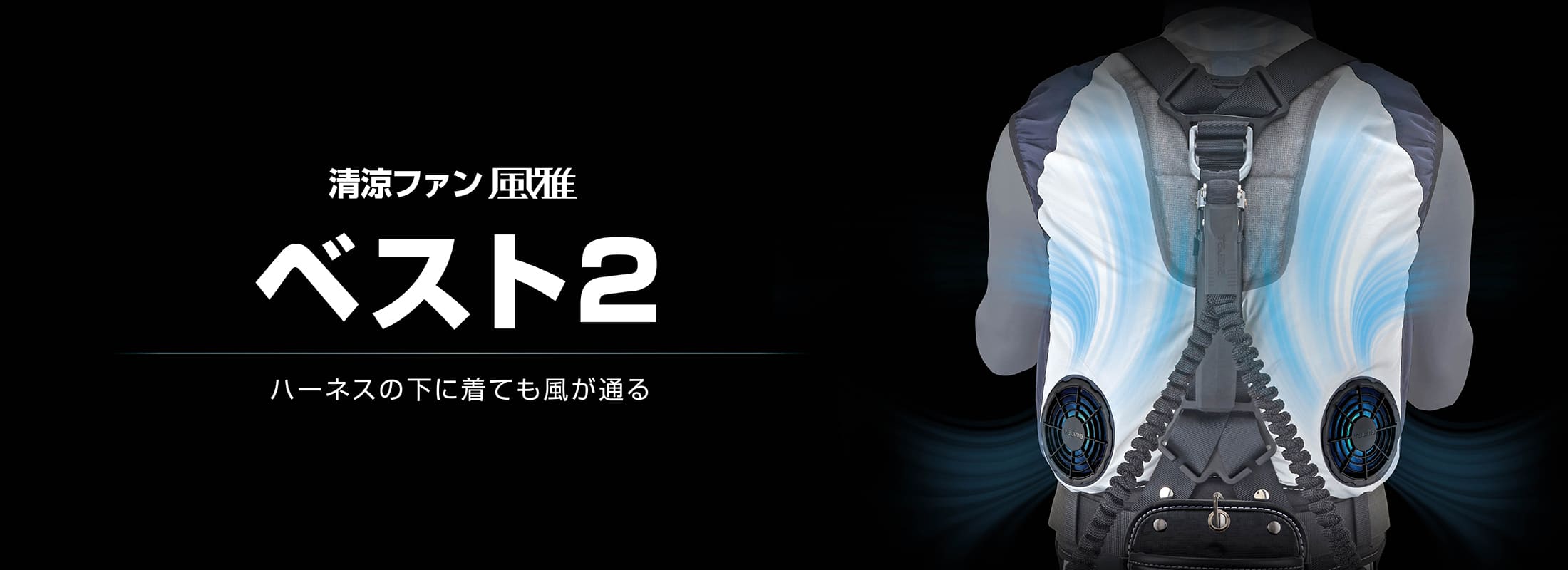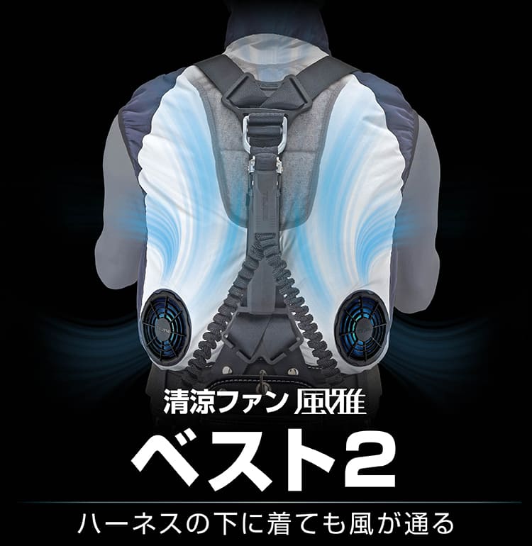 ハーネスの下に着ても風が通る、ハーネスの着脱が簡単なファン付き作業服。大風量の強力ファンユニット搭載。